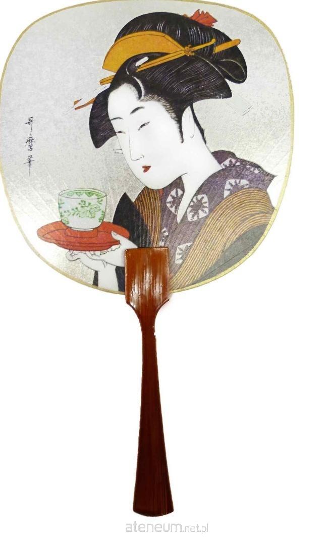 Elegancki japoński karnet premium z piękną, artystyczną ilustracją. Przedstawia tradycyjny japoński wachlarz (uchiwa) z niezwykle barwną i bogatą sceną. Na powierzchni wachlarza delikatnie zarysowana postać japońskiej gejszy w tradycyjnym stroju, trzymająca filiżankę herbaty. Jej włosy są misternie ułożone i ozdobione żółtymi akcesoriami, a na ubraniu widoczne są wzory. Karnet w zestawie z kopertą, bez tekstu w środku.