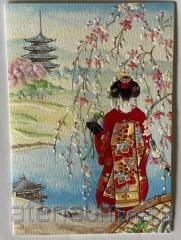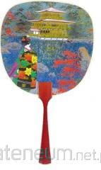 Elegancki japoński karnet premium z piękną, artystyczną ilustracją. Przedstawia tradycyjny japoński wachlarz (uchiwa) z dynamiczną sceną inspirowaną teatrem kabuki. Na powierzchni wachlarza widoczne są cztery wyraziste postaci w bogatych kostiumach i charakterystycznym makijażu: wojownik z czerwoną twarzą, mężczyzna w białej twarzy trzymający miecz oraz dwie inne dramatyczne postacie. Kompozycja pełna jest ruchu, intensywnej czerwieni, złota i kontrastów. Wachlarz ma ciepły, czerwony drewniany uchwyt. Karnet w zestawie z pasującą kopertą, bez tekstu w środku.