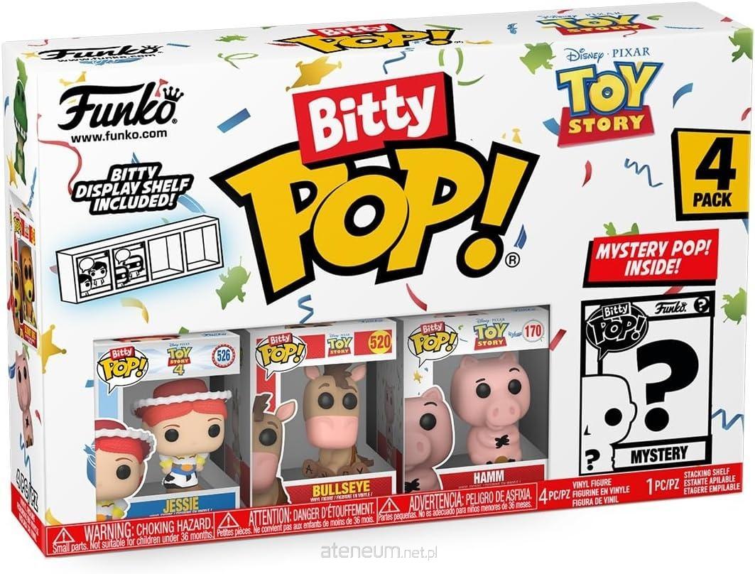 Funko Bitty POP! - Toy Story 4-Pack. Zestaw miniaturowych figurek kolekcjonerskich z kultowej serii Toy Story, zawierający m.in. Jessie, Bullseye i Hamm oraz figurkę-niespodziankę. W komplecie mini półka ekspozycyjna. Idealny wybór dla fanów Disneya i kolekcjonerów Funko.
