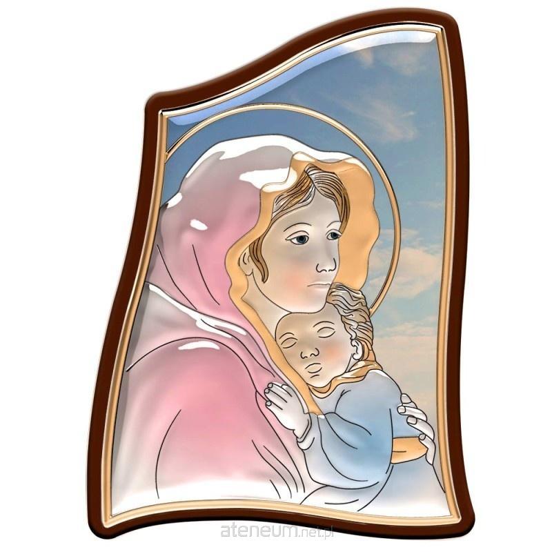 Wizerunek Matki Bożej z Dzieciątkiem jest przedstawiony w delikatnych kolorach, które harmonijnie łączą się ze srebrnym tłem, nadając scenie głębi i subtelności. Obrazek jest wykonany ze srebra, a jego powierzchnia została częściowo kolorowana, co pięknie podkreśla detale i dodaje mu wyrazistości. Srebrny, kolorowany wizerunek jest umieszczony na solidnej, drewnianej podstawie, co dodaje mu naturalnego uroku i stabilności. Do obrazka dołączona jest również praktyczna podstawka, dzięki której jest on od razu gotowy do postawienia.