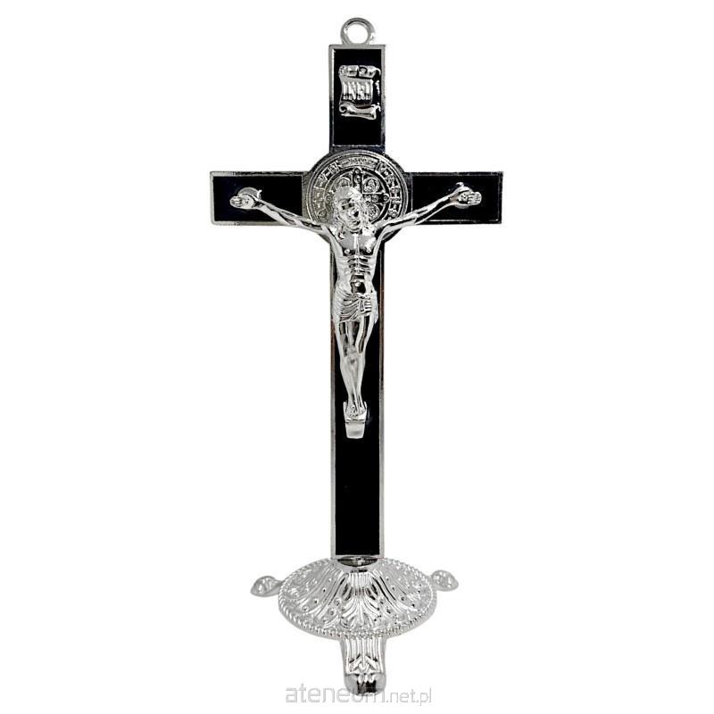 Krzyż ma około 23,5 cm wysokości (z podstawką) i 10,5 cm szerokości, co czyni go dostojnym akcentem w każdym pomieszczeniu. Wykonany z trwałego metalu,wyróżnia się srebrnym kolorem i unikalnym, czarnym wypełnieniem, które nadaje mu wyjątkowego charakteru. To intrygujące połączenie kolorów podkreśla jego formę i symbolikę.