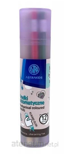 Kredki automatyczne Astra z wysuwanym grafitem bez konieczności temperowania w plastikowym etui. 12 kolorów
