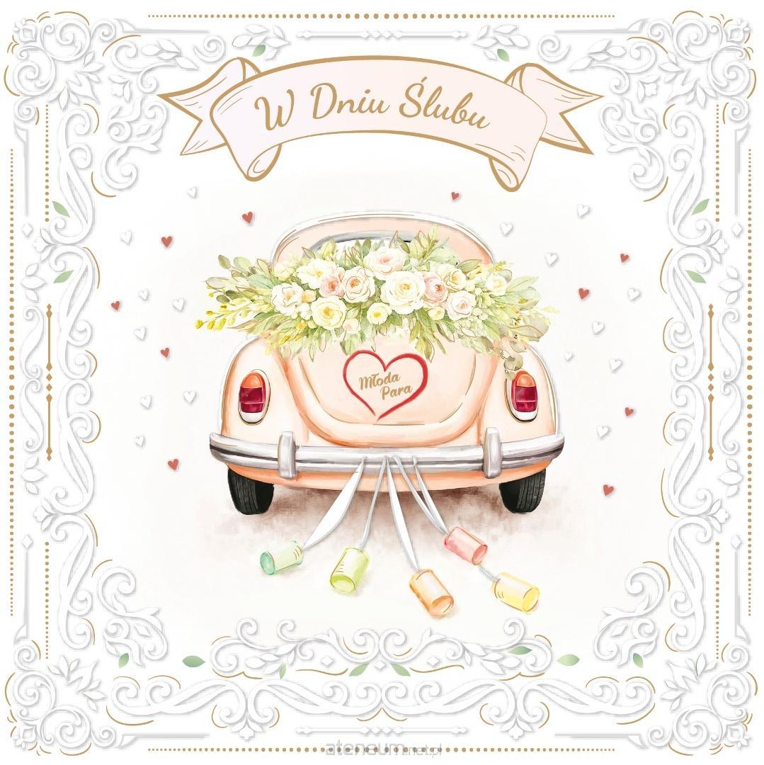 Karnet ślubny z kopertą, złocony i tłoczony, tekst życzeń w środku.