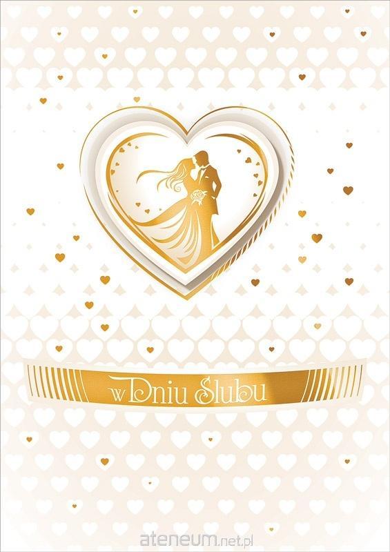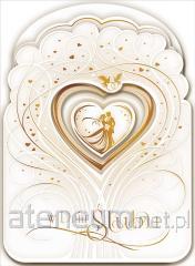 Karnet ślubny z kopertą, naklejane elementy, złocony, tekst życzeń w środku.