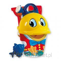 W zestawie: wiaderko, pokrywka pełniąca jednocześnie rolę sitka, żółte grabki i łopatka, foremka w kształcie jednorożca, fioletowa konewka zdobiona brokatem