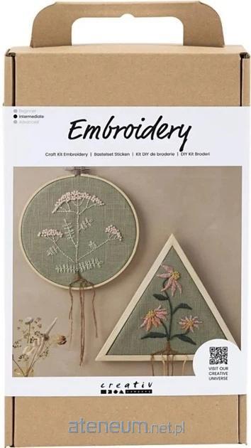 Zawartość: mulina, tamborek, igła do haftu, nawlekacz do igły, trójkątna ramka, 2 kawałki tkaniny, wzór do naniesienia i instrukcja.\n\nTen zestaw pomoże Ci nauczyć się haftować. Zawiera wszystkie potrzebne materiały i instrukcje.\nAby wykonać dwie dekoracje ścienne będziesz musiał wyhaftować motywy kwiatowe przy użyciu 5 różnych węzłów i ściegów.\n\nTa aktywność skierowana jest do młodzieży i dorosłych. Zeskanuj kod QR prowadzący do wideo-instrukcji.\n\nPoziom trudności: średnio zaawansowany.