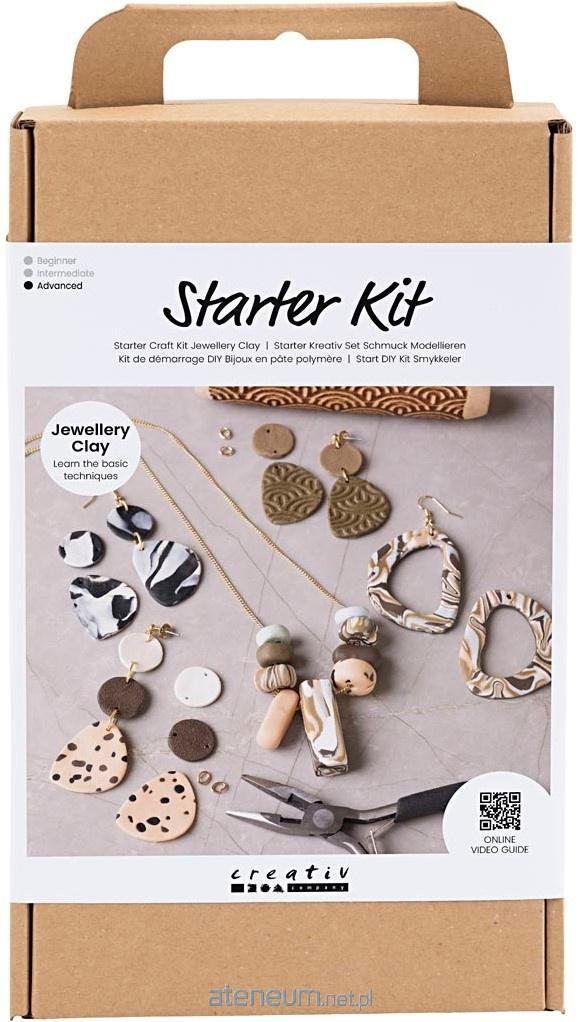 Zawartość: Glinka polimerowa w 8 kolorach (po 20 g każdej), 4 foremki do wykrawania, wałek, wałek ze wzorem, igła do glinki, ostrze do wycinania kształtów w glince, 2 arkusze papieru ściernego, szczypce jubilerskie, 4 sztyfty do kolczyków, 4 bigle do kolczyków, kółka do biżuterii, łańcuszek.