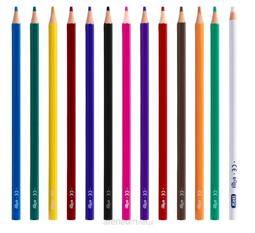 Kredki bezdrzewne, 12 kolorów, z gumką w kształcie kredki.